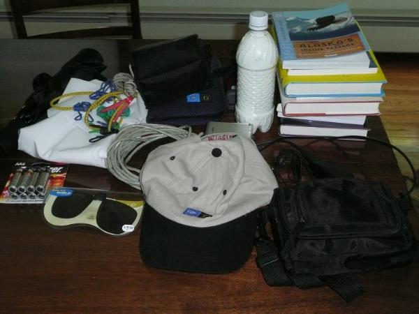 digital camera, spare camera batteries, spare AA batteries, laptop, USB cable, etc. etc. Oh