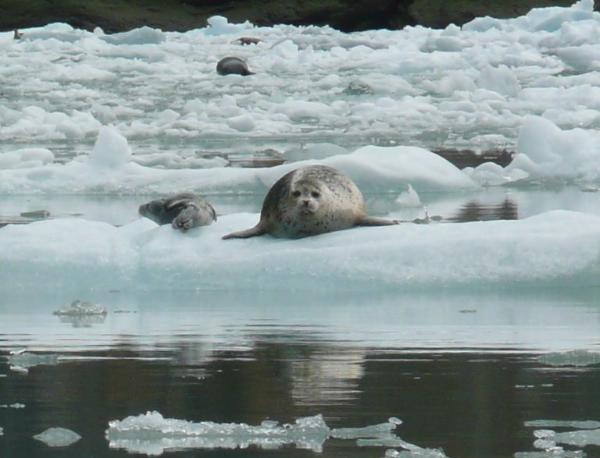 A seal mom and her pup. They favor the small ice benches during birth and until the pup is